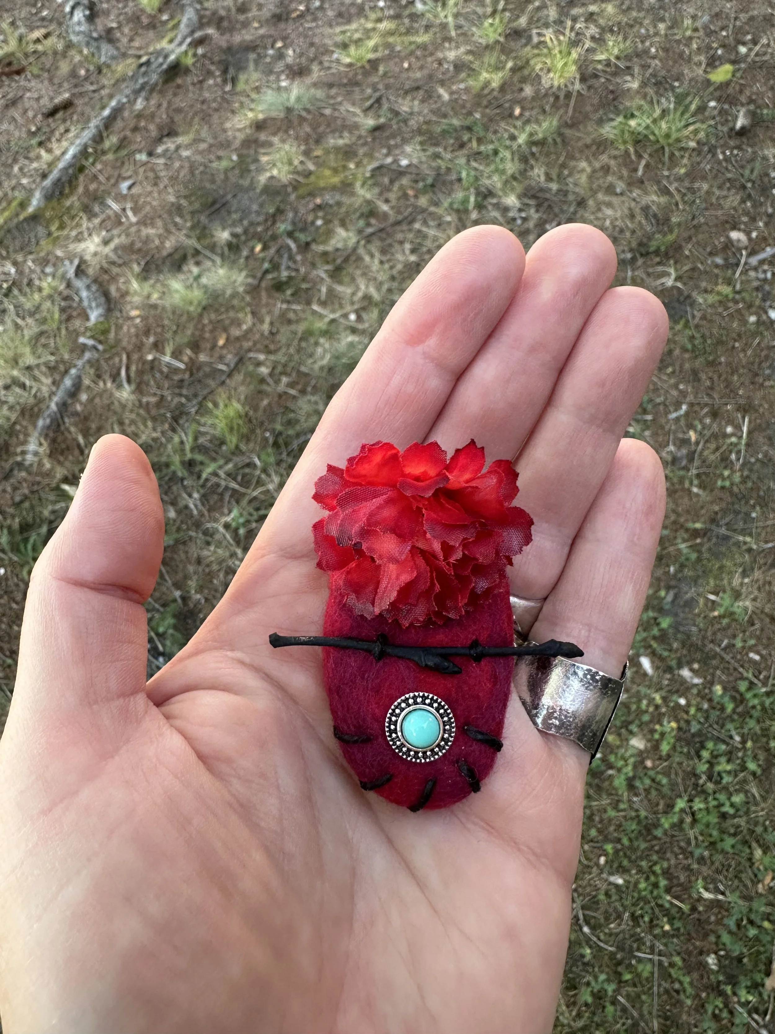A bright red heart crowned in flowers and defiance. Though small in form, Musefire blazes with self-possession — a tiny altar to self-expression, beauty, and unapologetic being. The black painted brow reminds us that power doesn’t ask permission to take up space.