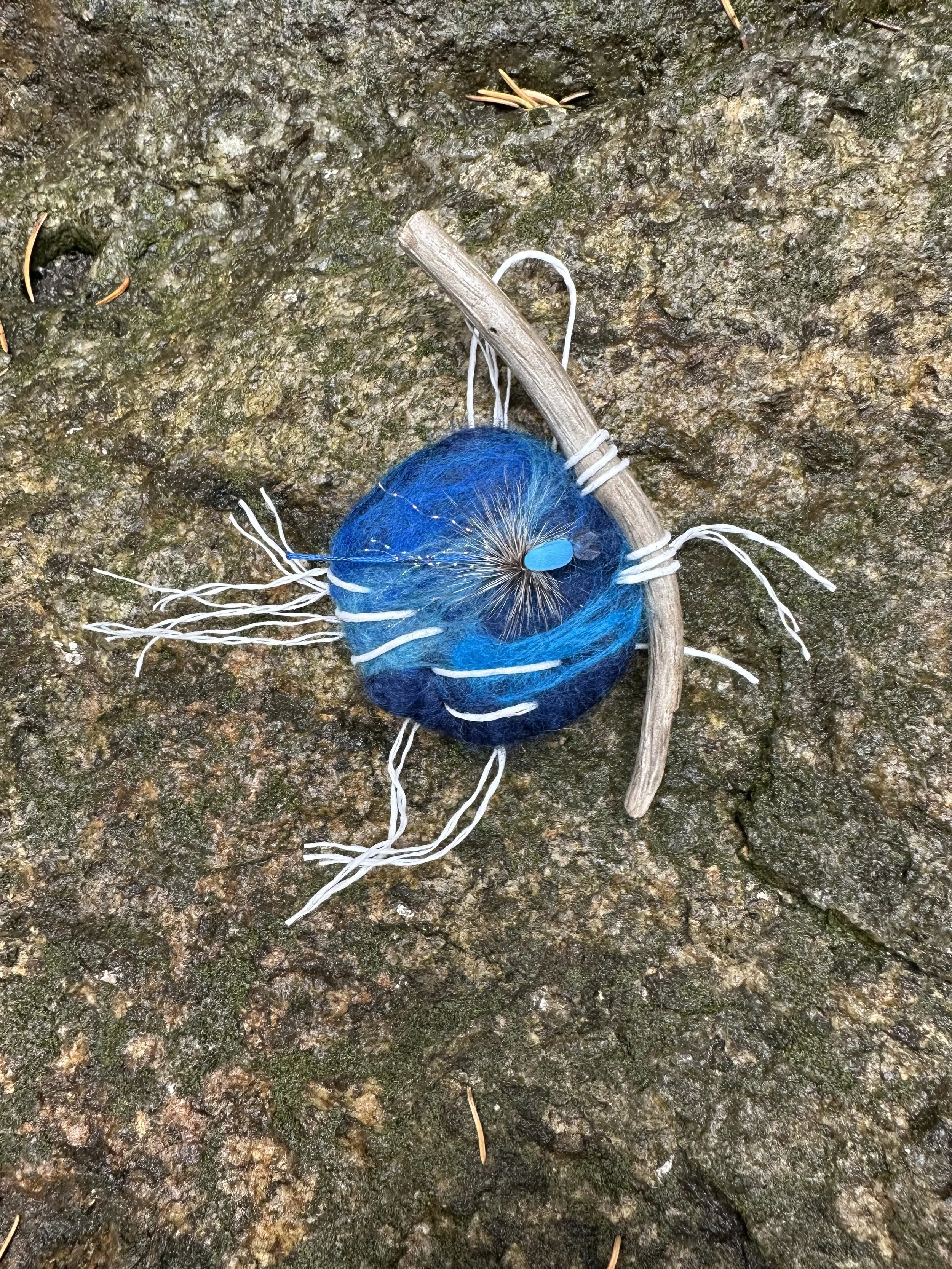 A dark navy sea opens beneath bright aqua and seafoam waves, each line of felted motion carrying a tiny fly that has become something more—dragonfly, kite, spirit-messenger. Angled as if mid-flight, this piece is all forward momentum, the pure delight of