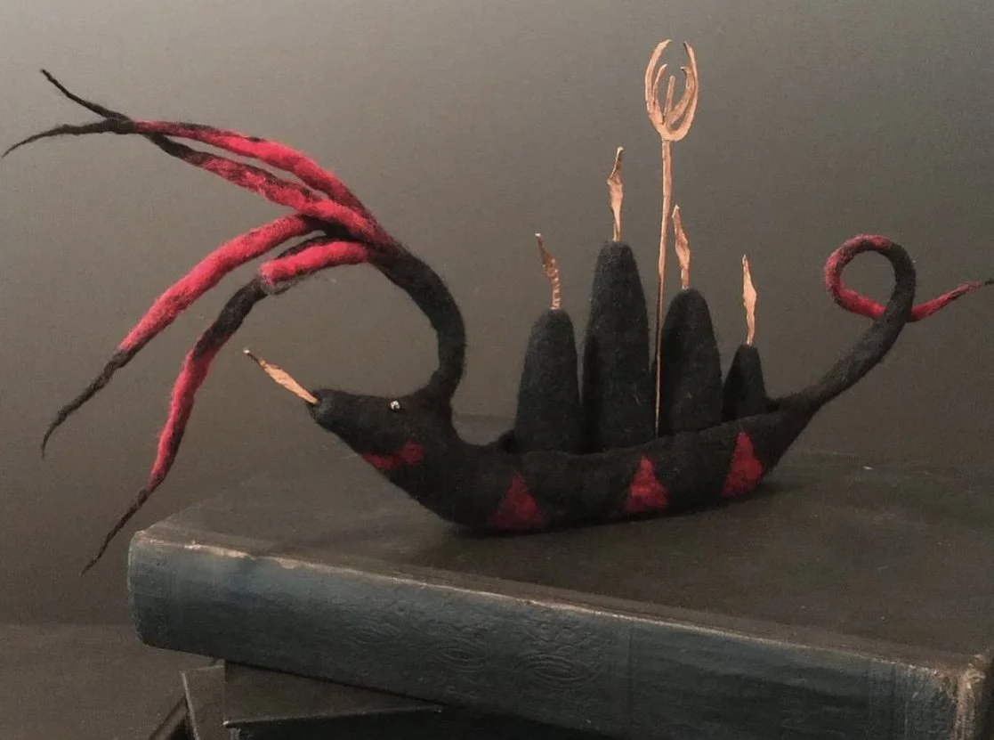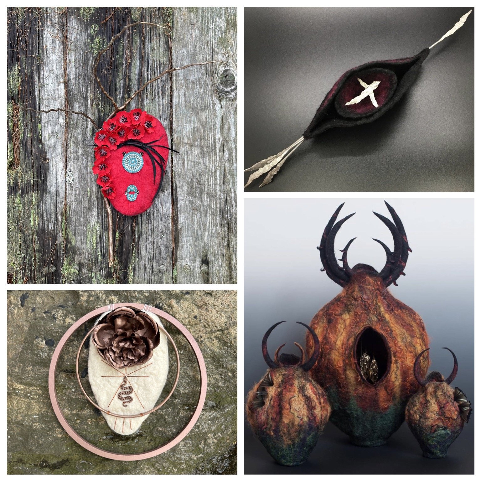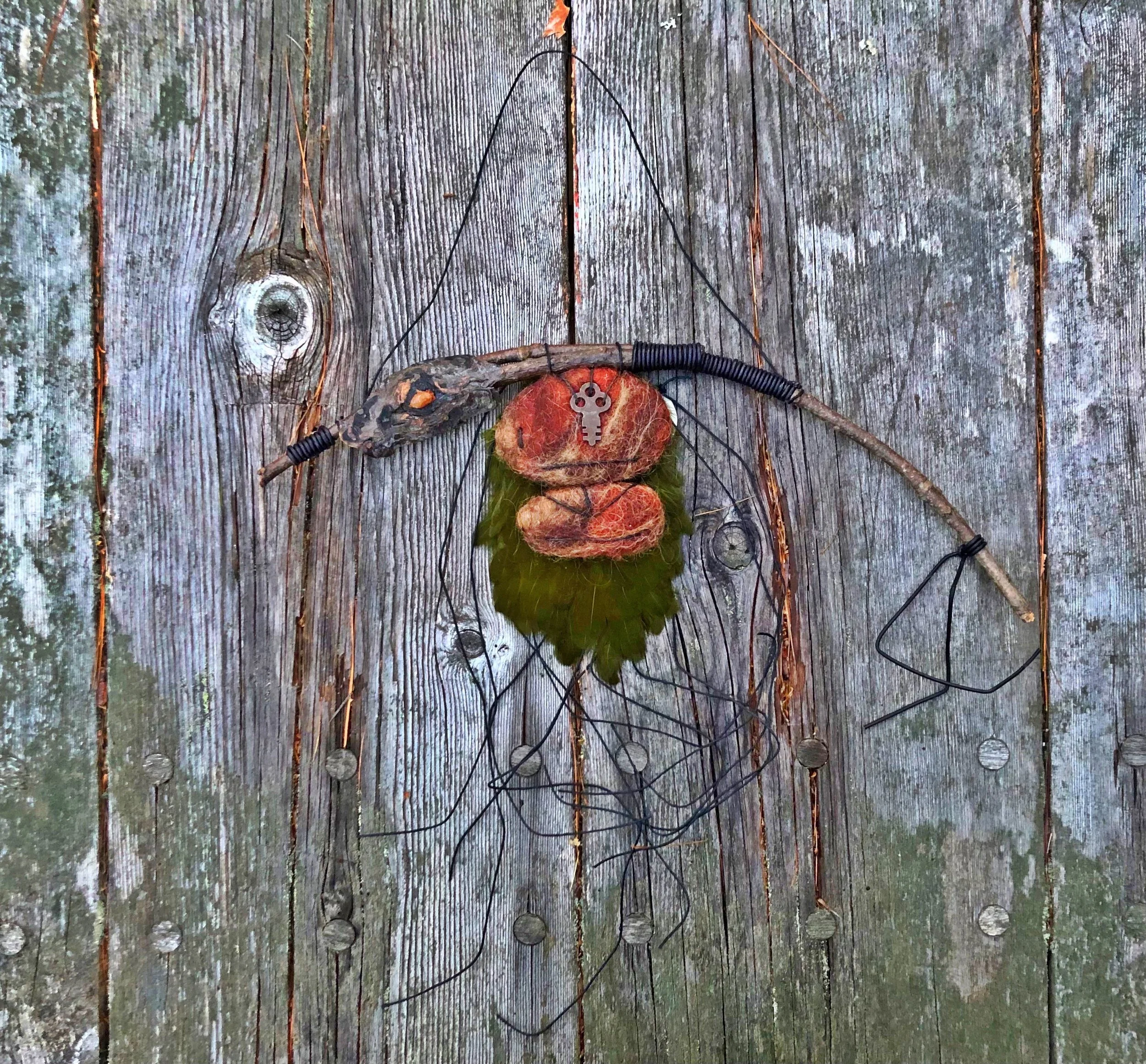 Start to look at inspiring images, sketch out design ideas, talk with your compassionate guides (if that’s something that you do), take a walk in nature for inspiration, collect objects and images to bring with you to the workshop to serve as inspiration, and / or collect items from nature or an item you would like to incorporate into your felted piece (like a stick, feather, crystal, bead(s) or jewelry piece).